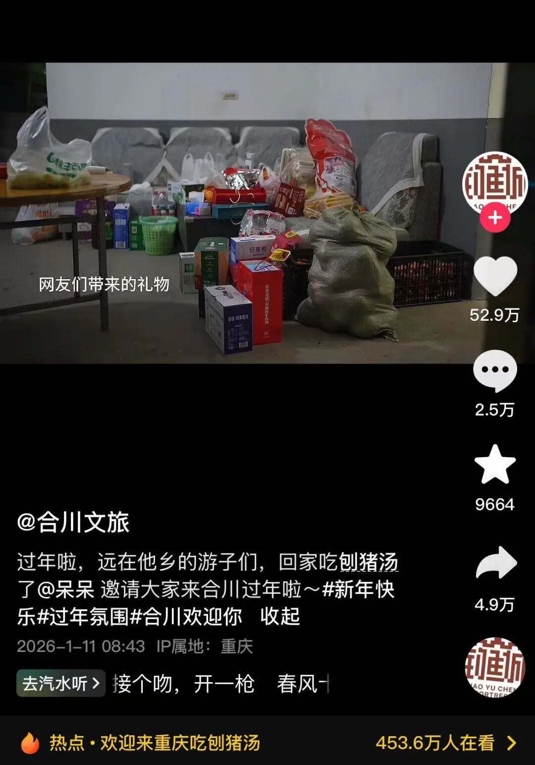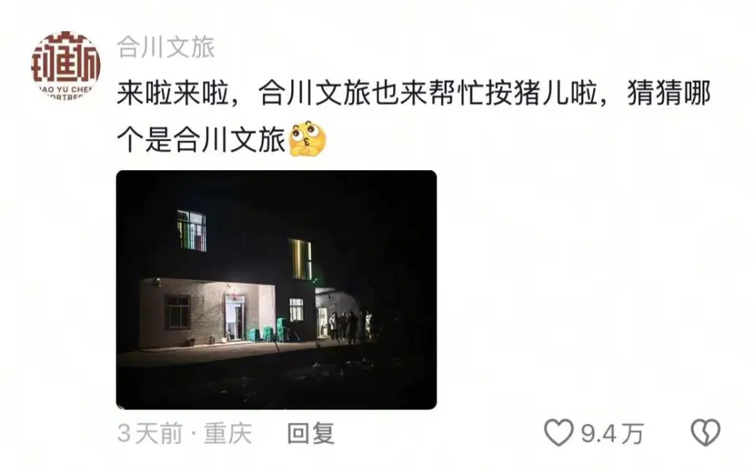 就是这段“土味”十足的视频,在发布后迅速引爆网络。观看量从几千、几万一路飙升至数百万;点赞、评论和转发呈指数级增长。“合川”“呆呆”“摇人按猪”相继登上社交平台热搜榜。