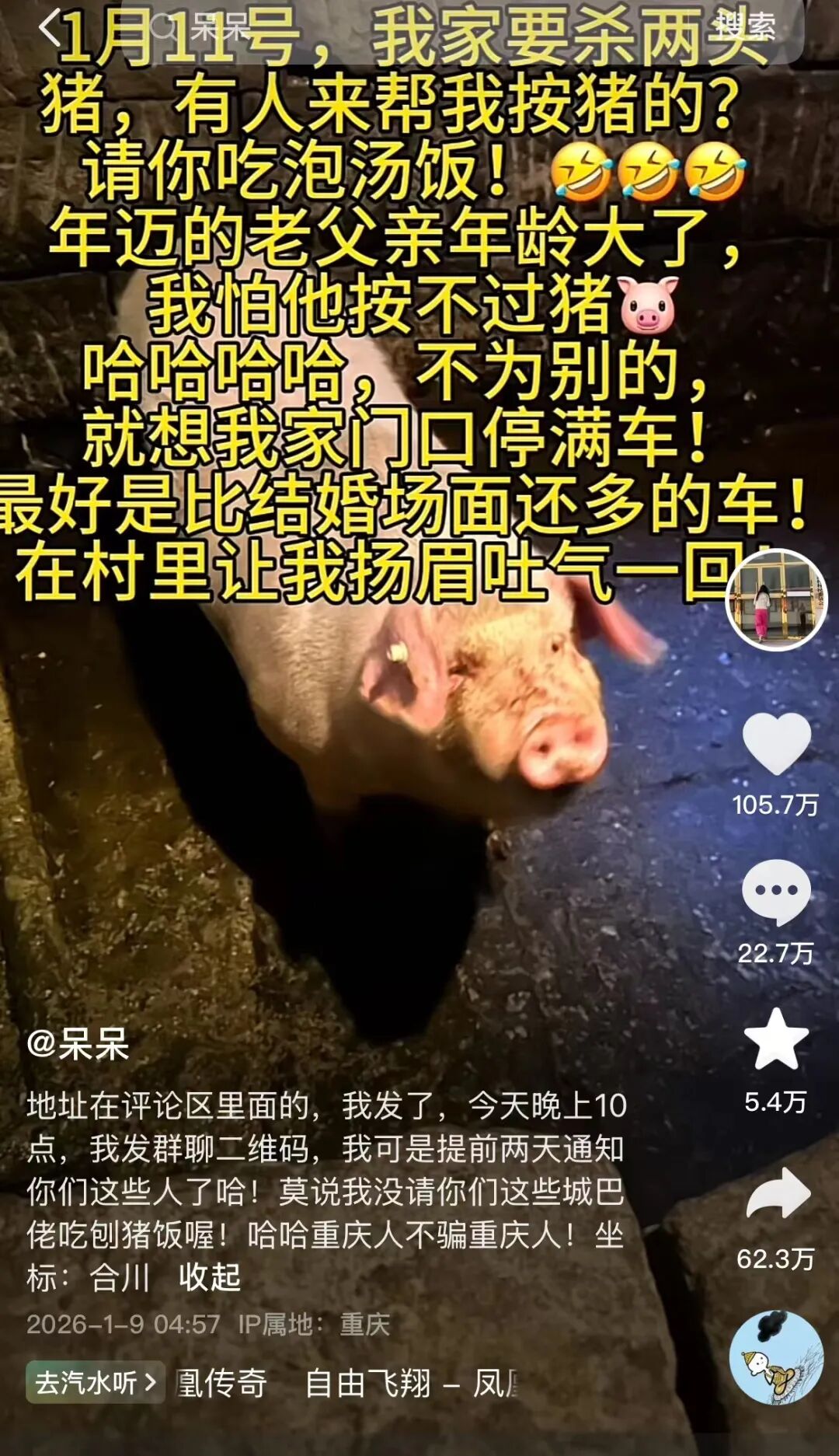 她没找亲戚邻居,而是掏出手机,拍摄了一段短视频发在社交平台:“1月11号,我家要杀两头猪,有人来帮我按猪的?请你吃泡汤饭!”视频里,背景是典型的农村房屋,没有滤镜,没有剧本,甚至没有精致的构图,一段话铺满屏幕。
